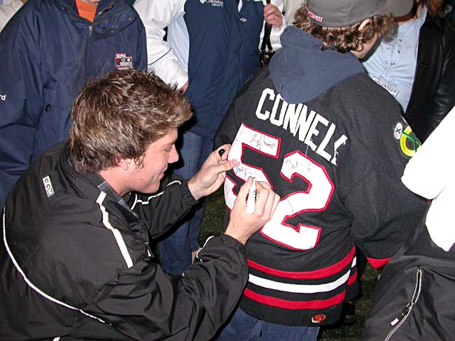 the hockey tournaments, Yorba Linda Blackhawks defenceman Kevin Livoti signs team monitor Dylan Render's Blackhawks jersey after their final game Sunday.Photo by David Dickenson
