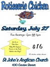 | Saturday, July 27, 2019 5:00 pm EDT | Rotisserie Chicken DinnerSaturday, July 27 at St John's Anglican Church, 490 Centre St, Prescott. Seatings at 5 and 6pm. Eat in or Take out. Enjoy a picnic in the park before the Shakespeare Play. Half-chicken dinner with salads and dessert for $16. |