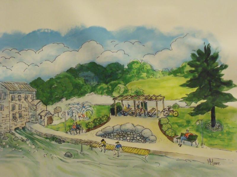 The project plan, designed by Mary Moore of Cedar Lane Studio, was unveiled and presented to community members at an informational event at the Spencerville Mill June 28. The proposed plan includes gardens, benches, picnic tables, wheel chair accessible pathways, bike racks, recycling bins, a pergola for sun shelter, historical panels, and an information kiosk with a map of village businesses and points of interest.