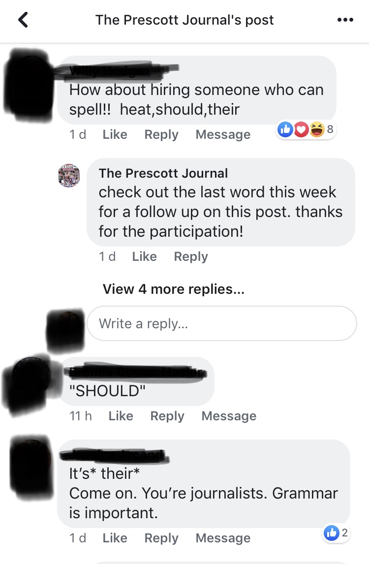 I would like to state that I would follow up every comment with 'check out the Last Word this week for a follow up to this post.' As you can see in the photo, I made sure people could still read and understand what I was saying but still the angry comments kept coming. A couple people even stated that we should not call ourselves journalists and that five-year-olds can spell better than us. One person even was so outraged that they kept coming back to the post to comment over and over.